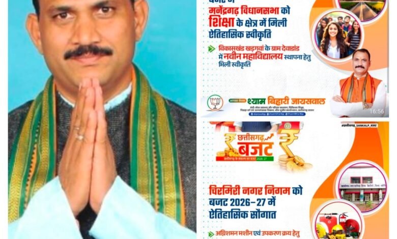 मुख्यमंत्री विष्णुदेव साय के नेतृत्व में प्रस्तुत संकल्प बजट 2026-27 ने मनेन्द्रगढ़-चिरमिरी-भरतपुर (एमसीबी) जिले को ऐतिहासिक सौगात दी है। बजट प्रस्तुतीकरण के बाद सामने आए स्वास्थ्य मंत्री श्याम बिहारी जायसवाल ने बताया कि यह केवल बजटीय घोषणा नहीं, बल्कि क्षेत्र के समग्र विकास का ठोस खाका है। उन्होंने कहा कि नगरीय सुरक्षा, स्वास्थ्य, शिक्षा, सिंचाई और आधारभूत संरचना के क्षेत्र में अभूतपूर्व प्रावधान किए गए हैं। जिससे ना सिर्फ एमसीबी जिले का समग्र विकास निहित होगा बल्कि जनअपेक्षाओं के अनुरूप विधानसभा मनेंद्रगढ़ विकास के नए सोपान का स्वाद भी चखेगा, यह पूरा बजट 2047 के अनुरूप विकसित भारत, विकसित छत्तीसगढ़, विकसित विधानसभा को लेकर है। श्री जायसवाल ने मनेंद्रगढ़, खड़गवां और चिरमिरी को लेकर आंकड़ेवार जानकारी दी, उन्होंने बताया कि बजट में चिरमिरी, मनेंद्रगढ़, खड़गवां समेत एमसीबी जिले को क्या क्या मिला है?